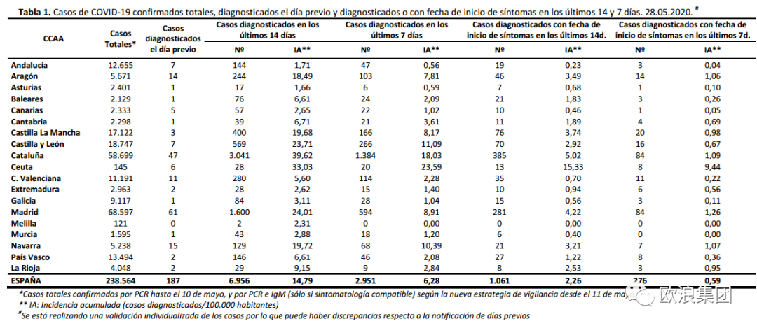 (La Vanguardia图片) 欧浪新闻5月29日(马德里 柳传毅编译) 西班牙至今日中午12点为止,累计PCR核酸确诊238564例,对比昨天累计为237906例,等于一天里多了658例(其中187例属于过去24小时确诊)。依据卫生部图表数据,西班牙最近14天来增加了6956例,平均日增496例,最近7天合计增长2951例,平均日增为421例。死亡记录方面,合计死亡27121例,此数字比昨天多2例,过去7天新增死亡为39例(卫生部不再通报单日死亡记录,改为7天记录)。痊愈数字持续一周多无通报。