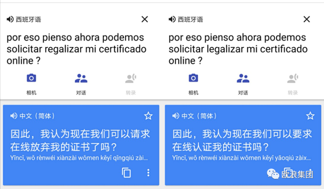 图:一个字母之差,翻译的内容就完全不同 "现在咨询律师说,现在要么走法庭上诉,花费1500欧左右和一两年时间不等,要不然就是在重新花钱办扎根居留,同样需要很长时间。不知道这情况什么办法是最快能把居留办下来。" |