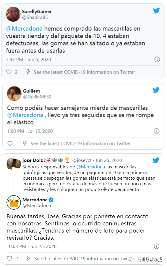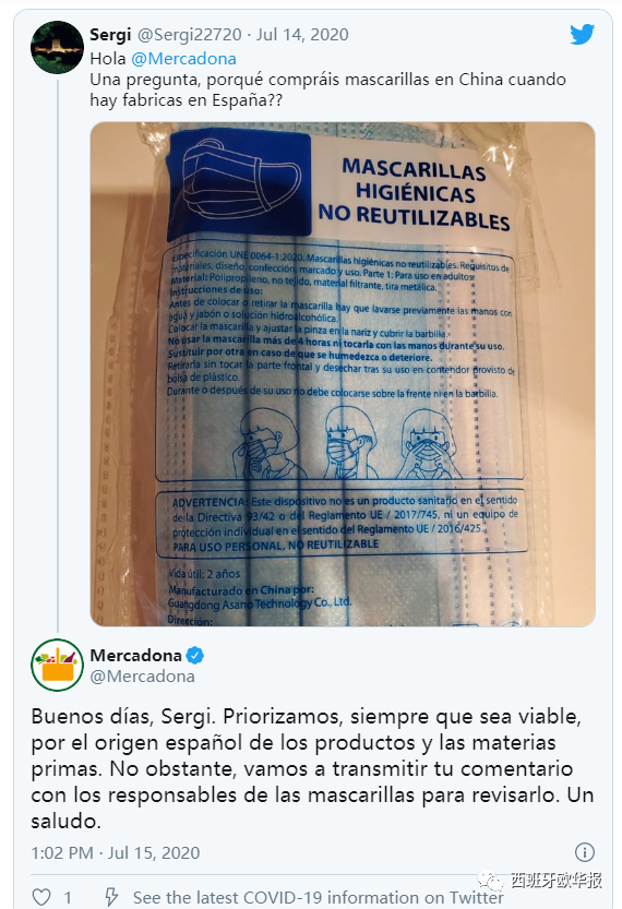 Twitter上有一名叫Sergi22720的网友特地@Mercadona:“问个问题:西班牙不是没有自己的口罩生产工厂,为什么还要跑到中国买口罩?” Mercadona的回应是:“在可行的情况下,我们是优先考虑西班牙产地的产品和原材料。不过,(既然您诚心诚意的发问了),我们会将您的评论发送给负责口罩的人员进行审查。” 据悉,该产品的包装上写明口罩由中国公司Fujian Minjun Biological Technology Co.Ltd生产。而该产品是经过UNE 0064标准认证过,在西班牙的1,600多家超市均有销售。且根据消协OCU的研究表明,超市所售口罩具有有效的过滤性及良好的透气性。