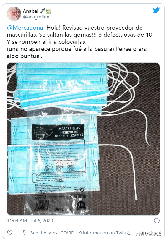 然而,事实是,不止Sergi22720一个人在网上质疑Mercadona的口罩产品质量问题。不少人在Twitter上反映自己买的这款口罩绳子容易断,根本不牢固。 来源:欧华报 |