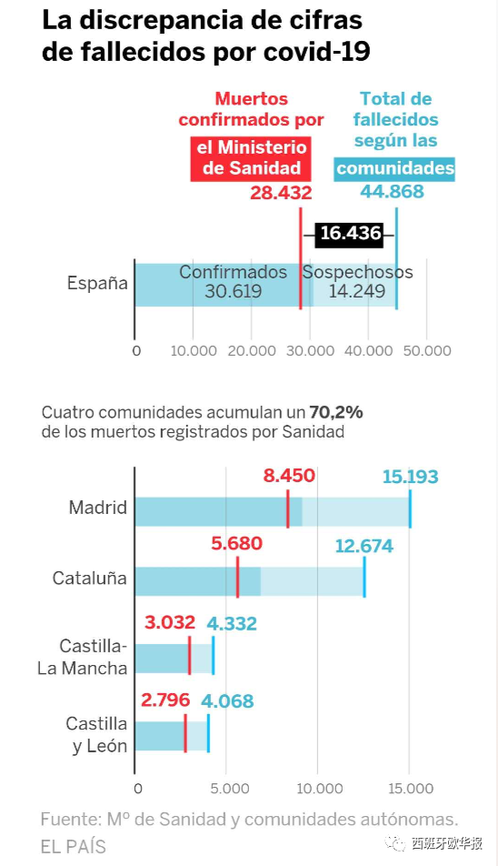 卫生部称6月2日往前1个星期内,马德里大区没有上报任何死亡患者,但马德里大区却称,在该时间段内上报了80名死亡患者。最近一个星期,西班牙卫生部上报加泰地区新增2例死亡患者,但加泰卫生部称7天内已经上报32名患者死亡。