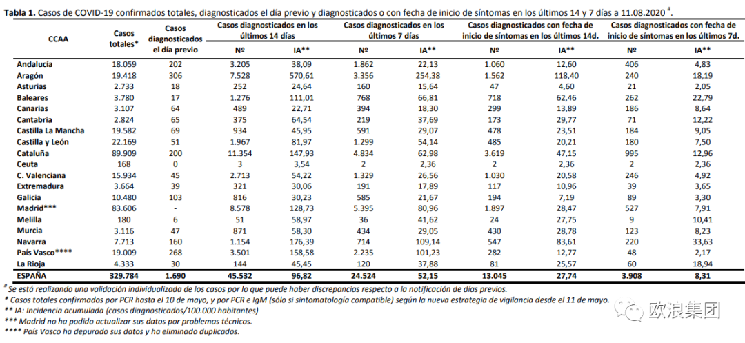 图:马德里多家老人院爆发严重,Valdemoro一老人院有10名老人确诊。马德里老人院曾是3月份时的主要爆发点,许多老人院出现集体死亡。马德里曾扬言加强了老人院管控,但如今的情况是马德里老人院重新成为爆发主角。 欧浪新闻8月12日(马德里 柳传毅编译) 西班牙今天新增3172例,虽然比昨天3632例要少,但西班牙新冠疫情继续严重。 因西班牙疫情大爆发,西班牙的老伙计意大利也对西班牙采取入境限制措施,意大利艾米利亚-罗马涅(Emilia-Romaña)和普利亚(Apulia)两个大区宣布针对从西班牙而来的入境者采取不同的入境控制措施,具体而言,艾米利亚-罗马涅对所有从西班牙而来的人强制进行核酸检测,普利亚则对定居在西班牙的入境者采取隔离14天措施,但到过西班牙的游客则不必,入境控制措施从今日起生效,被意大利两个大区一并列进入境控制名单的国家还有希腊和马耳他。 昨天,德国将西班牙马德里和巴斯克两个自治区列入高风险区名单内,此前,德国已经将西班牙加泰罗尼亚、阿拉贡和纳瓦拉拉三个自治区列入这个旅游“黑名单”,警告德国人不要到西班牙这些地区旅游。德国疫情今日出现复发,今日单日新增1226例,德国政府为新的爆发表示担忧。