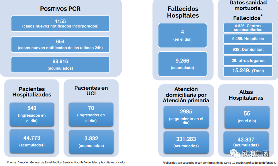 依据马德里大区卫生部官网的通报(上图),马德里自治区累计PCR确诊为88916例,比昨天多1155例,其中654例属于在过去24小时内新增。 西班牙卫生部记录马德里至昨天为累计PCR确诊83606例,这比马德里大区的PCR数字要少5000多例,可能原因是马德里把以前的抗体确诊也合计在内,而卫生部则筛选除出抗体检测数字。无论如何,马德里今日比昨天多出1155例,日增全国最高。 马德里目前在院540例,UCI重症70例,新增死亡4例,累计死亡9266例。马德里目前有2985例居家治疗。马德里的入院压力近日陡然剧增,为此,马德里大区宣布将所有非紧急性手术日期押后。 代理马德里市长的副市长Begoña Villacís今日说,马德里所有的爆发点都得到控制,她承认马德里的日增有显著增长,但马德里人“可以安心”,因马德里疫情得到了控制。Begoña Villacís女士表示马德里的口罩使用率非常高,甚至全欧洲最高,所以,虽然马德里市民的表现非常好和马德里疫情得到控制,但马德里人不可松懈疫情措施。 比较难解的是,马德里并无加泰罗尼亚和阿拉贡那样的大规模社区传播,自解封以来一共发现39个爆发点,其中20个仍在活跃中。马德里大区政府自称所有爆发点都得到了控制,但马德里也是最不透明的大区,只说爆发点出现在家庭或者工作环境,从不透露爆发点具体在哪里。 来源:欧浪网 |