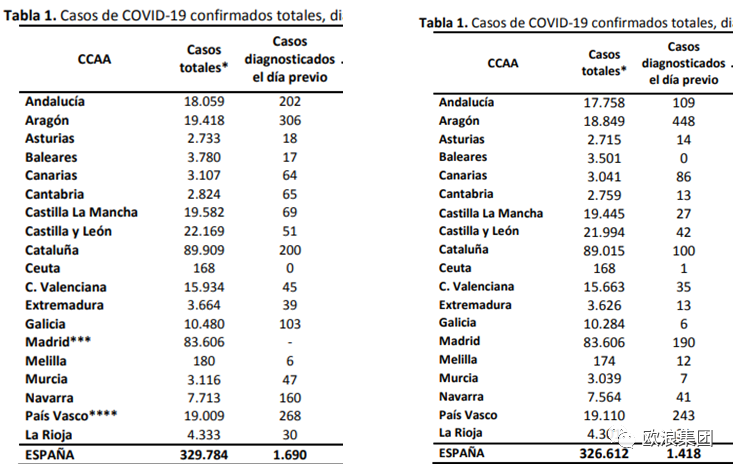 -马德里+486,累计83606*(此为昨天数据,卫生部因技术问题无更新) -加泰罗尼亚+894(443),累计89909-89015 -阿拉贡+569(461),累计19418-18849 -安达鲁西亚+301(285),累计18059-17758 -巴利亚群岛+279(358),累计3780-3501 -瓦伦西亚+271(252),累计15934-15663 -巴斯克+268(244),累计19009-19110* -加利西亚+196(39),累计10480-10284 -卡斯提亚•莱昂+175(600),累计22169-21994 -卡斯提亚•拉曼查+137(178),累计19582-19445 -穆尔西亚+77(75),累计3116-3039 -加那利群岛+66(86),累计3107-3041 -坎塔布尼亚+65(13),累计2824-2759 -纳瓦拉+59(130),累计7713-7654 -埃斯特雷马杜拉+38(13),累计3664-3626 -拉里奥哈+32(32),累计4333-4301 -阿斯图尼亚斯+18(14),累计2733-2715