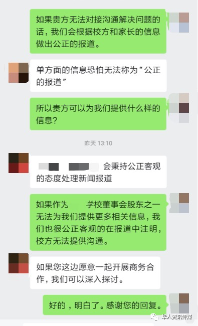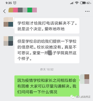 家长们表示,总校校长曾亲口答应她们,不上的课程可以退还。但是,从一月份至今,学校却一拖再拖,给出了几项家长们无法接受的方案。例如:退款50%或者下学期开学,将学费按70%抵算等。 虽然学校为了在疫情期间,能够让孩子们继续学习中文,想尽了一切办法,克服困难,开设了丰富多彩的网课和一系列的缴费优惠措施。但是家长们纷纷表示,对网课和校方给出的措施不满意,要求退款或给出一个公正合理的解决方案。而很多参与了学校网课的家长也表示,受到了不公平的待遇。 有家长表示,现在中文教育学校很多。该地区就有很多其他学校将学费全部退还给了大家,并且有可以自主选择网课的权利,价格也非常优惠。 为了进一步了解事情,我们根据家长提供的微信名片联系了该校区负责人钭校长,但是未能通过好友申请。随后,我们又联系了校董事会的股东之一,陈校长,得到了以下的答复。校方负责人表示,愿意展开商务合作和深入探讨,但是多次拒绝正面回复关于学校和家长之间的纠纷问题。