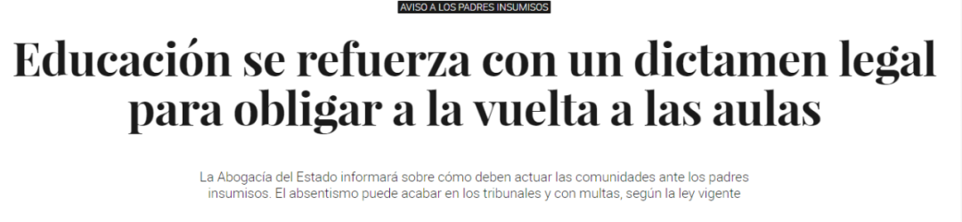 然而,教育部计划用法律手段强制父母送孩子上学的做法受到“安全返回教室”组织的强烈回应! “法庭上见” “安全返回教室”组织的发言人Josu Gómez说:“如果政府想使用司法途径,没问题,法庭上见!”他警告说在大流行得到控制之前不打算带孩子上学的父母,在任何情况下,包括最极端的情况下都会用法律手段为自己辩护。 “我们也提倡让我们的孩子重返校园,也提倡面对面上课,但是要安全,但事实并非如此。感染比例没有下降,12或15名学生组成稳定群体的措施也没有得到保证。传染率正在飙升,我们已经看到我们周围的国家正在发生什么,这些国家试图以正常的方式回到学校,但没有采取安全措施。在这里,他们想用“低成本”重新开学,就好像一切都是正常的,虽然有消毒液和口罩,但没有安全条件。”Josu Gómez说。 Josu Gómez称“安全返回教室”组织中的这群父母非常清楚,这不是由于监护人“漠不关心或缺乏兴趣”而造成的旷课的问题,而是在全球大流行期间的特殊情况。 这个组织为所有父母提供法律建议,以防他们不得不在法庭上为自己辩护。Josu Gómez警告说,他们也不排除在每个大区发起集体诉讼,反对重返校园的可能性。 马德里政府代表称中央政府防疫降级措施效果不佳!