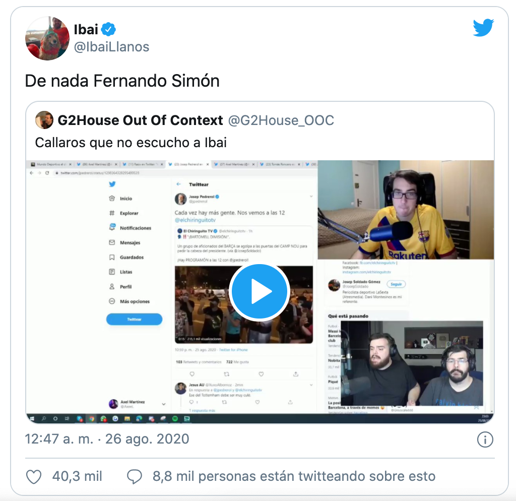 26日,伊拜·拉诺斯(Ibai Llanos)有发布一条推文,明确传达一条信息:“不用客气,费尔南多·西蒙。”通过这种方式,这名**r想向西蒙展示“网络名人”对年轻人新冠疫情认知的重大影响力。 来源:欧华报 |