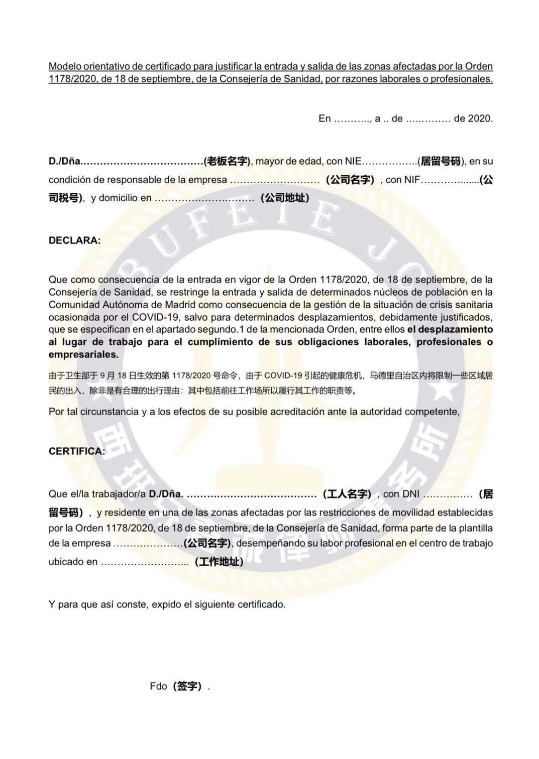 马德里卫生部在推文中附上了网页链接,供市民下载填写,除了员工自行填写名字、身份证、公司地址和税号外,公司也必须在该证明中二次核实该员工的身份信息。