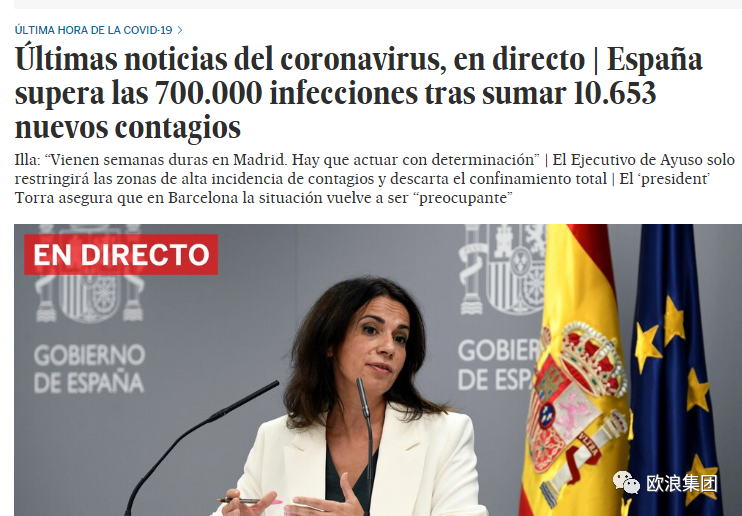 欧浪新闻9月24日(马德里 柳传毅编译) 西班牙《国家报》表示,西班牙新冠病例累计突破70万大关,过去一天新纪录10653例,西班牙近一周多保持每日新增上万例。马德里继续是全国最令人担忧的自治区,卫生部预告马德里此后几周将非常艰难。疫情第二严重的加泰罗尼亚大区也出现担忧,该大区主席托拉今日表示巴塞罗那的病例回升“重新让人担忧”。 欧盟委员会今日发出严重用词的警告,呼呼欧洲各国立即行动控制病毒扩张,欧盟表示欧洲有多个国家的情况非常令人担忧,欧盟警告说,欧洲在“决定性时刻”,这是“最后机会”,各国必须作出“更多决定”。这里的最严重国家包括西班牙和法国,西班牙确诊70万,比位居第二的法国48万高出22万例,版图跨越亚洲和欧洲的俄罗斯为112万例。 依据西班牙卫生部下午7点更新后的病毒数据,西班牙疫情至今记录704209例,西班牙从60万突破到70万只用了一周多时间,增长数字吓人。考虑到西班牙至昨天的累计为693556例,所以,西班牙一天内是增长了10653例,其中3471例属于在24小时内新测出,等于有6千多例在其他日子采集样本,但至今日才得出分析结果,这6千多例没有被卫生部记录为24小时新增。这是卫生部对日增的定义方式。