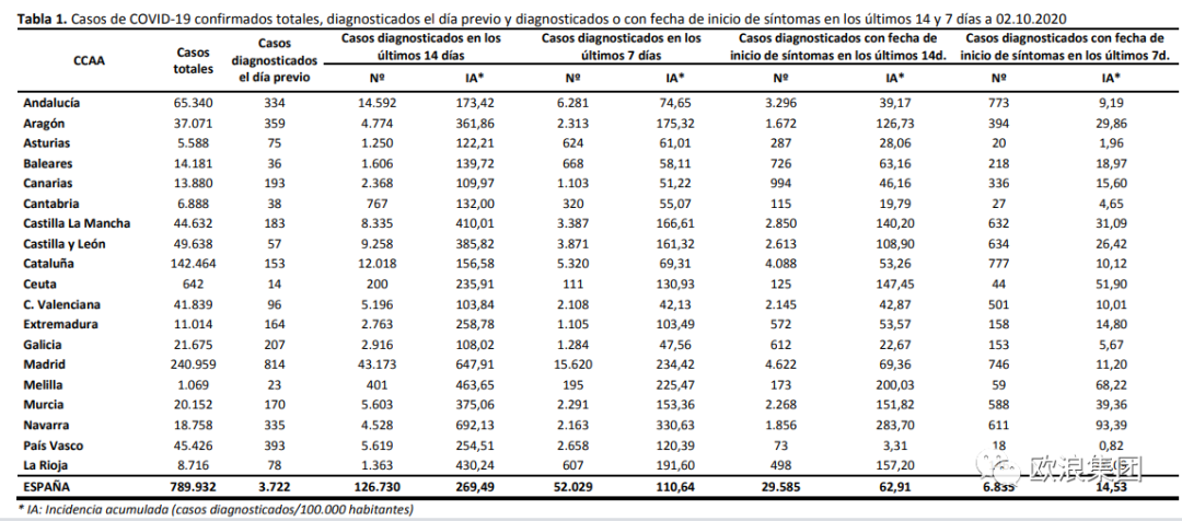 欧浪新闻10月2日(马德里 柳传毅编译) 《世界报》表示,在马德里今晚执行隔离措施之际,西班牙卫生部今日报告西班牙新增新冠患者11325例,这是西班牙昨天增长(9419例)不超万例后重新回升到万例之上。死亡数字方面,累计32086例,一天新增113例。 依据西班牙卫生部下午颁布的西班牙疫情数据,西班牙累计789932例,过去24小时新增3722例。西班牙至昨天的累计为778607例,所以,过去一天实际是增长了11325例。卫生部疫情表之所以只记录24小时只有3722例,等于有7千多例是在其他日子接受检测,但至今日才分析出阳性结果,这些被统计进累计内,但不记录为24小时新增,这是卫生部对24小时新增的定义,也即在24小时内接受检测和得出结果的才是24小时新增。