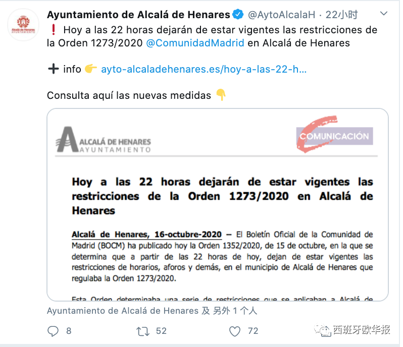 没有喘息? 西还在勉力抵抗第二波疫情 第三波又要杀来? ![]() Alcalá de Henares将放限 周五晚上开始生效 ![]() ![]() 具体限制包括: