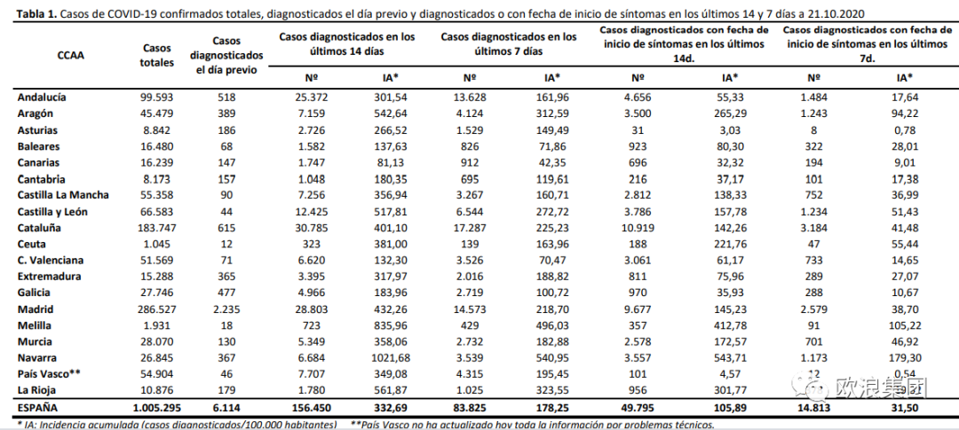 欧浪新闻10月21日(马德里 柳传毅编译) 西班牙新冠疫情突破100万例确诊,不仅病毒处在不可控的急剧扩张形势,西班牙还面临财政困境,期望欧盟许诺的经济重建基金能尽快到位,依据早前的协定,西班牙将从欧盟经济重建基金获得1400亿欧元援助,其中720亿为无偿直接汇款,剩余700亿为有偿借贷,西班牙原先预计欧盟的救助金可以在11月左右分批到位,但紧急要钱的西班牙可能还要耐心再等下去。 欧盟向全欧27个成员国提供的7500亿欧元经济重建基金是通过市场融资获得,尽管疫情最严重的西班牙以及意大利等都在眼巴巴等候资金到位,但欧盟的行动在不断推迟,今日,欧盟宣布说,欧盟委员会计划在2021年夏天发行第一批欧洲债券,欧盟将能够通过发行第一批债券为欧洲复苏计划提供经济重建资金。这等于说,西班牙在年底前甚至要明年才能等到急剧渴望的救助金,为此延迟,西班牙今日无法安坐,西班牙外交部长今日向欧盟委员会要求说,欧盟向27个成员国提供的经济重建基金应该“尽快”,今日,有急需的卢森堡也坐不住,同样要求欧盟尽快提供救助金。 依据西班牙卫生部今日疫情数据,西班牙今日累计确诊1005295例,突破百万大关。依据报告,西班牙过去24小时新增6114例,但累计数字比昨天高出15199例,等于有4500例不在近24小时采集样本,但今日得出阳性结果。西班牙并新记录死亡156例,累计34366例。 西班牙在一周前也即到10月14日为止,累计确诊90.80万例,一周后突破100万例,过去一周平均每日1.4万例。西班牙疫情从2月底开始,自3月14日起激活的全国警报状态至6月21日结束,当时,累计确诊24万例,从解除警报起至今为疫情第二阶段,在此阶段合计确诊76万例,尽管死亡率要远远低于首个阶段。 西班牙至今跃居全球确诊100万例国家行列,但相比其他几个达100万例的国家,4700万人口的西班牙属于低人口,其余最高确诊大国如美国(3.28亿人)、印度(13.69亿人)、俄罗斯(1.45亿人)和巴西(2.15亿人)都是人口大国,人口规模超越西班牙多倍。 目前,全球确诊百万例以上的几个国家为: -美国778万例 -印度717万例 -巴西509万例 -俄罗斯132万例 -西班牙100万例 马德里自治区今日报告新增3440例(其中2235例为过去24小时新增)和39例死亡,尽管近日的迹象显示疫情有所缓和,但马德里保持严重,今日的日增比昨天记录1900例要高80%,属于剧烈回升。马德里至今累计286527例,占全国总数的30%,并即将突破30万大关,马德里并合计记录死亡17498例,其中老人院死亡4902例,医院死亡11491例,1075例在住家死亡,剩余30例在其他地方死亡。 来源:欧浪网