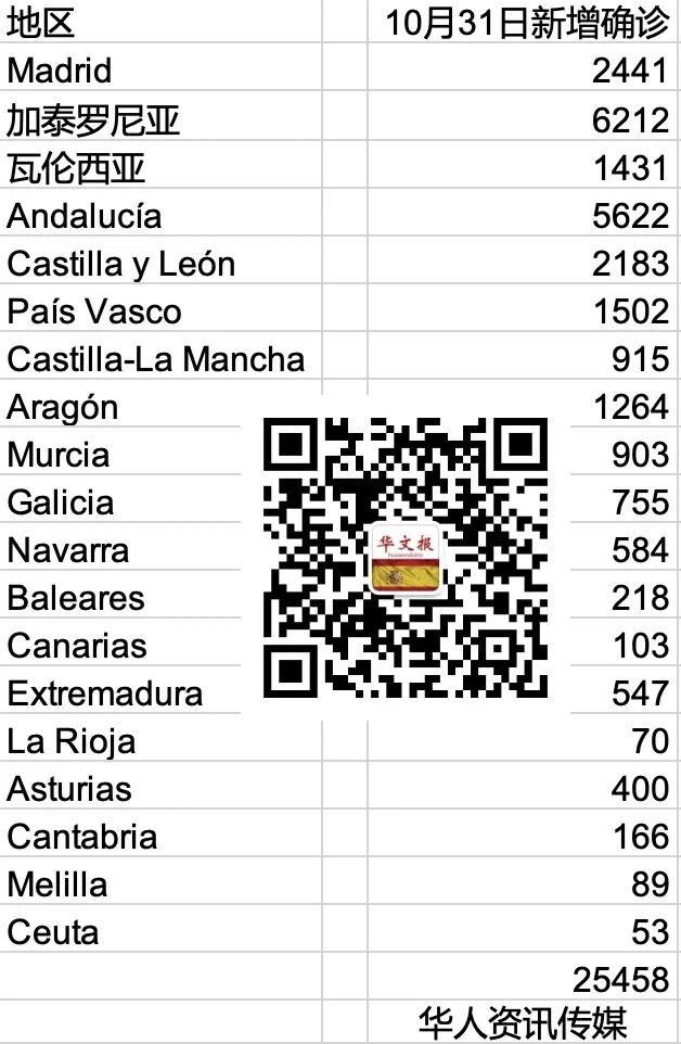 西班牙华人资讯传媒10月31日报道,根据小编整理的全国各自治区卫生部公布的最新数据,今日新增确诊感染25458人。按照卫生部的疫情指标,新冠感染风险在短短一天时间内,增了了3.7%以上。各地区确诊感染人数分别如下图标: