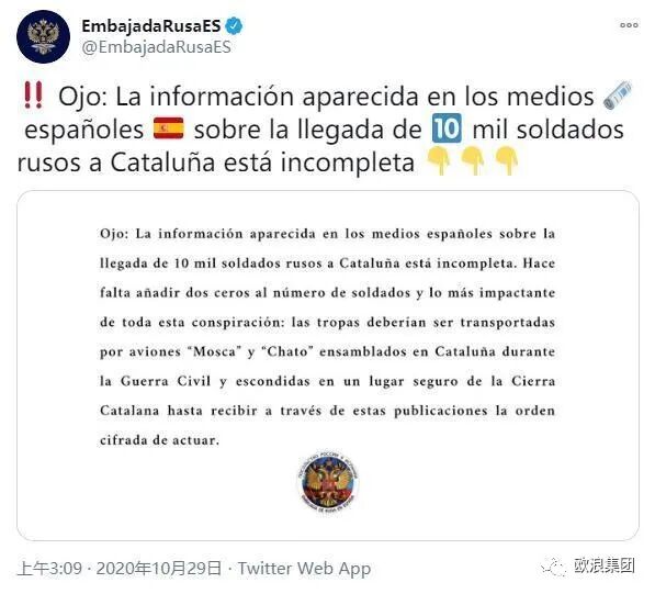 俄罗斯驻西班牙大使馆推文截图 俄罗斯大使馆写道:“应该给士兵人数加上两个零,而且这一阴谋最令人震惊的部分是:(俄罗斯)士兵会在内战时通过‘Fly’和‘Snub-nosed’(西班牙内战时期使用的两种苏联战斗机)飞机运送到加泰罗尼亚,在加泰罗尼亚的一个安全地方隐藏起来,直到他们收到通过这些媒体发布的采取行动的加密命令为止。” 这名加泰罗尼亚商人的被捕,以及随后对所谓俄罗斯协助加泰罗尼亚失败“独立公投”的调查,在巴塞罗那还引发了抗议活动。当地抗议者开玩笑地举着俄罗斯国旗,高唱俄罗斯民歌《卡林卡》,以展示他们与克里姆林宫的所谓“联系”。 来源:欧浪网 |