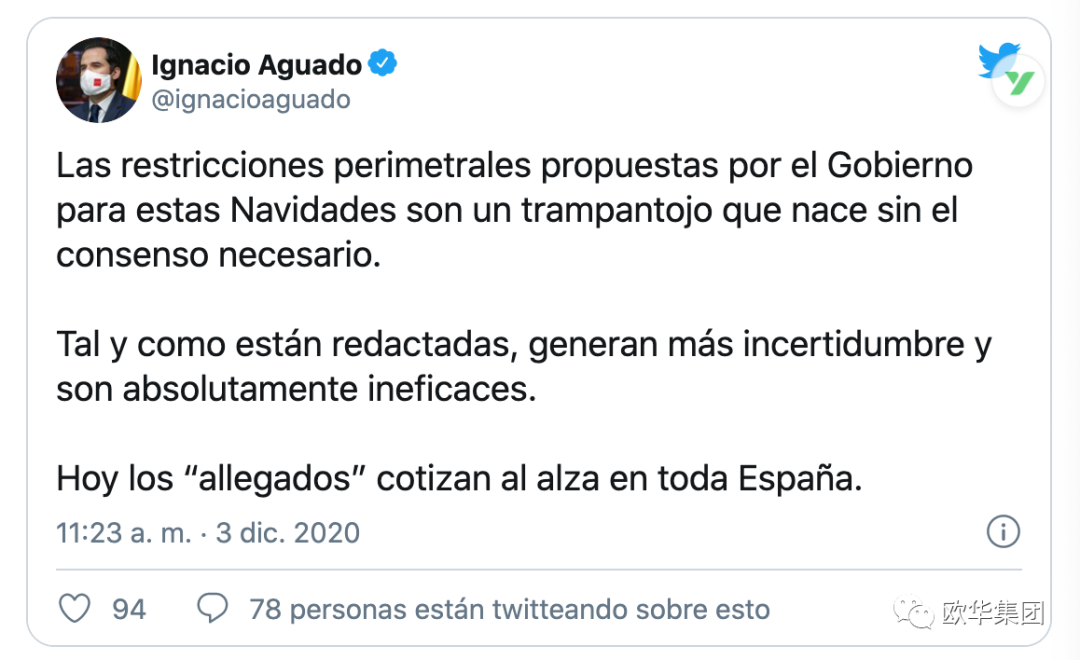 大区副主席推文 昨日伊拉在与坎塔布里亚大区主席Miguel Angel Revilla会面中说道:“信息已经非常明确,每个大区都有自己的立场,我不会代替谁做发言,但作为卫生部的发言人,我可以说昨天计划已经获得大多数的同意,这个圣诞我们应该呆在家里”。