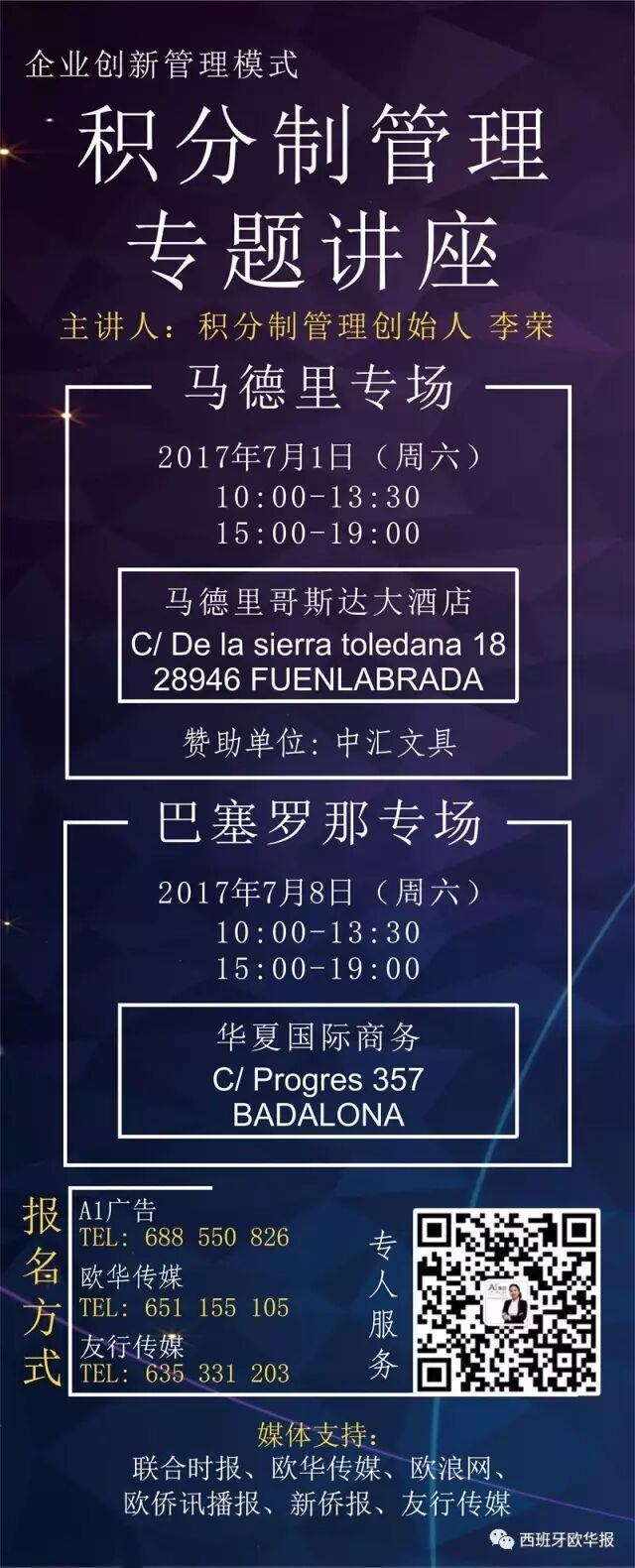 谈到这个问题,王杰表示,这个要看积分制管理是否适合您的企业了。 新闻发布会上,请出了Don Fruta集团兼Deco Casa家纺创始人王显勇先生,他与现场嘉宾分享了自己采用积分制管理后,给企业带来了哪些利益。 王显勇先生 王显勇先生首先对王杰先生表示感谢,感谢他将积分制管理带入西班牙,为旅西华商提供一个有效的企业管理工具,将企业引入一个新的领域。王显勇先生介绍说,他是在中国学习了积分制管理的课程,对积分制管理,他百分之百认可。在企业的管理中,无法做到均衡到位,但通过积分制,可以有效衡量员工的价值。对人才,我们可以让他有动力和精神为企业带来更大的效益。 在新闻发布会上,王杰先生还为现场来宾介绍了积分制管理的创始人李荣老师。李荣,湖北群艺集团董事长、中国积分制管理创始人、中国管理科学研究院企业管理创新研究所兼职副所长、中国中小企业家年会副主席、马来西亚积分制管理协会主席。 2001年创办湖北群艺,2003年独创积分制管理,并开始试行。用积分调动员工的积极性、用积分增强制度的执行力、用积分培养员工的好习惯、用积分建立健康的企业文化、用积分打破分配中的平均主义、用积分留住人才、用积分建立优秀的管理团队、用积分解决管理中的各种困惑。短短的几年时间,带来了公司的高速发展,资产扩大了20倍,效益增加了50倍,创造了中小企业的发展奇迹。2008年开始,其独创的“积分制管理”面向全国推广,目前已有数万家中小企业开始使用,给全国中小企业带来了巨大的经济效益。2011年,中国管理科学大会上,积分制管理被中国管理科学研究院选定为“管理创新项目”。2012年,李荣先生被聘为中国管理科学研究院企业管理创新研究所兼职副所长,并受到了顾秀莲、陈昌智等国家领导人的亲切接见。在第六届中国中小企业家年会上,湖北群艺荣获“全国服务中小企业先进单位·十佳人力资源管理机构”。2013年积分制管理先后走进复旦大学、北京大学。2014年,李荣先生被中国管理科学研究院授予“管理创新人物特别贡献奖”,同时,这套全新的经营管理模式已走出国门,并在马来西亚、新加坡等国家和地区中小企业中大力推广。2015年4月,李荣先生在马来西亚“21世纪至尊品牌大奖暨环球企业总裁大奖颁奖典礼”上荣获“环球企业总裁大奖”殊荣。2015年7月,李荣先生被授予“中国管理模式创新十大时代影响力人物”。2015年8月,李荣先生在第八届中国管理科学大会上荣获“中国管理创新杰出人物”称号。2015年10月16日,李荣先生在马来西亚获得了“2015年百强企业国际金鹰奖”。2016年5月,李荣先生受邀出席韩国第十一届“济州高峰论坛”,并发表积分制管理专题演讲。 出席新闻发布会的华商企业主听了王杰先生的阐述,对积分制管理产生了浓厚的兴趣,大家纷纷报名,要求听取西班牙积分制管理专题讲座的课程,亲临积分制管理创始人李荣先生7月1日在西授课的现场。现场报名的华商还获得了一套680元人民币的积分制管理光盘。 现场报名 您是否对积分制管理产生了浓厚的兴趣?不要担心,错过了这场新闻发布会,我们还为西班牙华商安排了两场积分制管理专题讲座的课程。第一场是7月1日在马德里歌斯达大酒店,第二场是7月8日在巴塞罗那批发区的华夏国际商务,都由李荣老师亲自主讲,专题讲座门票只需100欧元,其中包括听课费、场地费和午餐费用。 部分华商合影 希望对积分制管理有兴趣的朋友快来报名,千万不要再错过这次机会啦!