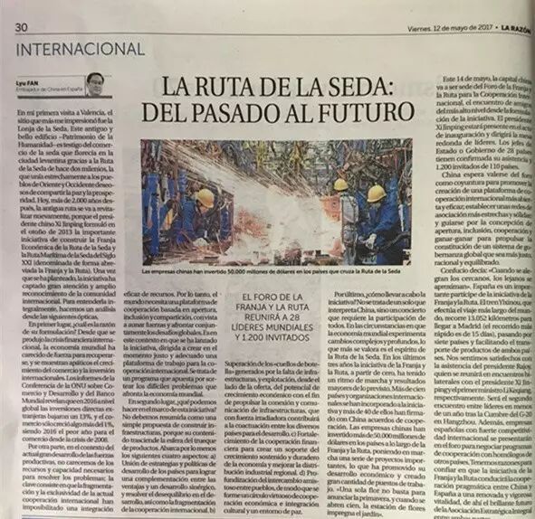 ![]() 5月12日,在“一带一路”国际合作高峰论坛即将开幕之际,西班牙《理性报》整版全文刊登吕凡大使署名文章——《丝绸之路:从历史向未来延伸》,全文如下: 当我首次访问瓦伦西亚时,被市中心古老而美丽的丝绸交易所深深吸引。这座世界文化遗产建筑,见证了一种精美的产品如何穿越万水千山和千年历史,将东方与西方紧密相连,分享着对和平和繁荣的向往。 千年后的今天,昔日驼铃悠扬的丝路焕发出新的勃勃生机。2013年秋天,中国国家主席习近平先后提出共建“丝绸之路经济带”和“21世纪海上丝绸之路”(以下简称“一带一路”)的重大倡议,得到国际社会高度关注和广泛认同。我们可以从以下几个角度更深刻、全面地理解这一倡议。 首先,为什么要提出“一带一路”倡议?国际金融危机以来,世界经济始终没有走出阴霾,贸易投资低迷不振。联合国贸发会议和世界银行报告显示,2016年全球外国直接投资下降了13%,贸易增长仅略高于1%,是2008年金融危机以来表现最差的一年。另一方面,在生产力空前发展的今天,我们并不缺乏解决问题的资源和能力,关键是现有国际合作的碎片化、排他性,导致我们难以把资源有效整合起来。当今世界迫切需要一个开放、包容、共享的合作平台,把各方力量汇聚起来,共同应对全球性挑战。在这样的大背景下,“一带一路”倡议应运而生,为国际合作创建了恰逢其时的合作平台,为应对当前世界经济难题提供了共同方案。 其次,“一带一路”倡议能做什么?我们不能把它简单地归结为仅仅是一个基础设施建设的倡议,因为它的内涵早已超越了古丝绸之路商品互换的范畴,至少包括以下四个方面内容:一是通过各国发展战略和政策对接,形成优势互补和协同发展,解决各国发展不平衡、国际合作碎片化的问题。二是通过集中突破基础设施不足这一发展瓶颈,从供给侧挖掘经济增长潜力,推进跨境互联互通,产生辐射带动效应,实现各国联动发展。三是通过加强金融合作,打造世界经济持久增长的支撑体系,完善区域的产业布局。四是通过深化各国人民友好往来,形成经济合作和文化融合的良性循环,营造和平安宁的发展环境。 第三,“一带一路”倡议如何实施?它不是中国一家的“独奏曲”,而是各国共同参与的“交响乐”。在世界经济形势发生复杂深刻的变化的今天,开放包容、合作共赢的丝路精神更显弥足珍贵。3年多来,“一带一路”坚持共商、共建、共享的原则,从无到有、由点及面,进度和成果超出预期。全球100多个国家和国际组织共同参与,40多个国家和国际组织与中国签署合作协议。中国企业对沿线国家投资达500多亿美元,一系列重大项目落地开花,带动了各国经济发展,创造了大量就业机会。 一花独放不是春,百花齐放春满园。五月十四日,“一带一路”国际合作高峰论坛将在北京举行,这是该倡议诞生以来最高规格的朋友圈聚会。习近平主席将出席论坛开幕式,并主持领导人圆桌峰会,目前高峰论坛与会正式代表总人数约1500人,来自130多个国家和70多个国际组织,包括29位外国元首和政府首脑。中方期待着以本次高峰论坛为契机,推动成立一个更加开放和高效的国际合作平台;以共商、共建、共享原则为遵循,构建一个更加紧密和强劲的伙伴关系网络;以开放包容、合作共赢理念为引领,推动构建更加公正、合理和均衡的全球治理体系。 子曰,近者悦,远者来。西班牙是“一带一路”倡议的重要参与方。目前世界运营里程最长的货运班列(义新欧班列)从中国义乌出发,穿越欧亚七个国家,绵延13052公里,最短15天即可到达马德里,极大方便了双方的货物运输。我们高兴地看到,拉霍伊首相将出席高峰论坛有关活动,并将分别同习近平主席和李克强总理举行双边会晤,这也是两国元首继去年G20杭州峰会之后,在不到一年时间内的两度会面。一些具有很强国际竞争力的西班牙企业将参加高级别会议,与世界各国同行们共商合作大计。我们有理由相信,在“一带一路”倡议的引领下,中西两国各领域务实合作将诞生更多充满创意和生机的合作成果,中西全面战略伙伴关系将迎来更美好的明天。 来源:欧华报 |