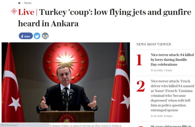 土耳其首都气氛紧张,部队已经控制交通要道。 土耳其显然发生了一场军事政变。 目前的局势非常混乱,细节不得而知,但是军队已经通过电视台和电邮发表了一份声明说,他们已经接管,而且数位文职领导人已经被逮捕。 军队的声明说,他们获取权力是为了维护民主秩序与人权将得到尊重。 不过,土耳其总理耶伊尔德勒姆说:“叫它军事政变也许不对”,但是确实存在“部分军队”存在非法企图,他们在指挥系统之外攫取权力。 耶伊尔德勒姆在私营的NTV频道中说: “民选的政府仍在执政。这个政府只有在人民让它下台时才会下台。” 在当地的记者们报道说,军机在首都安卡拉上空飞行,可以听到枪声。 安全部队封锁了通过博斯普鲁斯海峡大桥和征服者苏丹穆罕默德大桥的所有交通,这是伊斯坦布尔城里越过博斯普鲁斯海峡的两座主要桥梁。 土耳其发生政变,起初外媒称有军用飞机从首都上空飞过,有军队和坦克部署。虽然土耳其总理此后否认为政变,称叛乱被挫败,但紧张形势持续升级。土耳其军方通过国家电视台发布声明,称已推翻政府,全国戒严。 这是上世纪60年代以来土耳其军方发动的第5次政变。在传出土耳其首都有枪炮声和军队进入后,MSCI土耳其ETF指数一度大跌3%。 以下按时间顺序更新,最新的内容在最上方: 05:11 土耳其国家电视台宣读军方声明:土耳其政府已经丧失合法性并被推翻,全国实施戒严。 以下土耳其军方封锁博斯普鲁斯大桥图片来自盖蒂图片社。 ![]() 05:05 欧元兑美元刷新日低至1.1049,美元兑日元刷新日低至105.05。 05:04 希腊国防部官员在电话中否认拉响警报,称希腊武装力量密切关注土耳其局势。 05:03 土耳其执政党AK党议员Metin Kulunk:Gulen在军队的支持者们支持此次叛乱。呼吁土耳其全国人民拒绝服从军方。 04:59 土耳其情报机构负责人Yilmaz:政变企图将很快被挫败。 04:59 美国国务卿克里在莫斯科表示:我们希望土耳其和平稳定。 04:58 外媒:土耳其总统办公室称,总统安全。 04:58 WTI 8月原油期货短线上扬逾0.3美元,刷新日高至46.33美元每桶,土耳其军事政变让投资者担心中东能源供应秩序。 04:53 土耳其总统府:这是对土耳其民主的攻击。军方声明并未得到军队司令部授权。我们敦促世界与土耳其人民站在一起。 04:51 外媒:土耳其位于安卡拉的军事总部外面发生激烈交火。武装直升机在土耳其军队总部附近开火。 04:43 英国(专题)《天空新闻》:所有从土耳其伊斯坦布尔Ataturk机场起飞的航班都已经取消。土耳其国家广播机构遭到军队攻击。 04:39 土耳其外长Cavusoglu在Twitter发帖称:我们将保卫民主直至最后一刻。土耳其司法部长Bekir Bozdag称:土耳其检察官们对部分士兵签发逮捕令。土耳其政府不会逃跑,我们将保卫国家的意愿。 04:31 土耳其里拉兑美元已跌破3.00整数位心理关口,创6月24日以来新低。COMEX黄金期货在电子交易盘中上涨。澳元兑美元刷新日低至0.7564。 04:26 外媒报道,土耳其军方称已经控制国家,军方称,掌权是为了恢复自由和民主,保证所有国际协议的有效,保证与世界其他国家恢复良好关系。 04:19 外媒报道,直升机盘旋在土耳其军队总部上方。土耳其国家电视台TRT节目中断。土耳其总统Erdogan的府邸附近听见多次枪声。 04:05 土耳其总理 Binali Yildirim表示,叛乱被挫败,不能被称作一场“政变”。他说,军队内部出现一起叛乱,一些土耳其部队控制了一些机构,土耳其警方接到命令,必要时可以动用武力,土耳其政府不允许如此疯狂的行为。 03:46 路透社等外媒报称,可以听到土耳其首都安卡拉传出枪声和爆炸声。土耳其军方封锁了通往博斯普鲁斯海峡大桥的部分道路。 土耳其总统府发声明:”一小撮士兵”的政变图谋没有成功新华社快讯:土耳其总统府网站16日凌晨发表声明说,总统埃尔多安安然无恙,“一小撮士兵”的政变图谋没有成功。 土耳其伊斯坦布尔两座大桥关闭 桥上出现坦克土耳其宪兵15日夜关闭最大城市伊斯坦布尔的两座大桥。电视画面显示军机在低空飞行,桥上出现坦克。 另外,多架土耳其战机15日晚从安卡拉市中心低空飞过,当地媒体报道说这些战机是为了加强土耳其武装部队总参谋部附近的警戒。 |