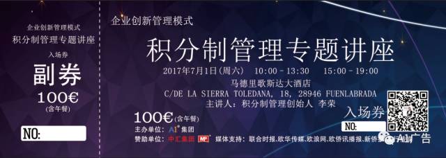 特别关注:7月1日马德里 7月8日巴塞罗那 积分制管理创始人李荣先生,受A1广告之邀亲临西班牙,分享积分制管理的专题讲座,为华人企业的员工管理、企业发展带来全新的管理方式及理念! A1广告面向全欧洲的华商发起邀约!我们将倾尽全力分享这个宝贵的管理方式,助力欧洲华商转型升级,让欧洲华人老板轻松做管理!