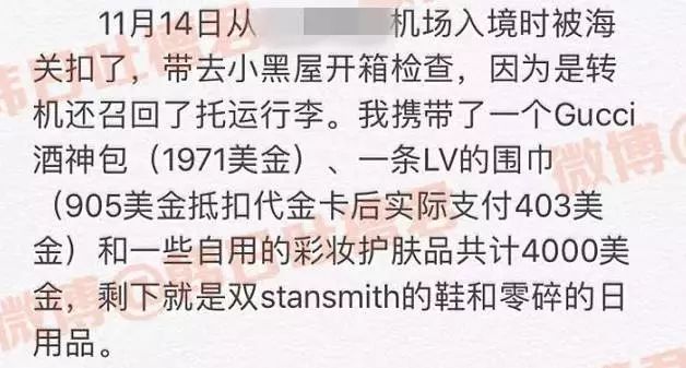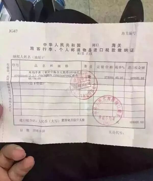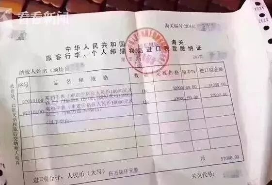 有些人出国旅游买买买是不得已,被亲朋好友拜托,还没走出国门呢,购买清单就扯出一堆。也有些人觉得出一趟国也不容易,一次就屯一年的货回来,不然多不划算啊!!! 但是,到回国之日,即使行李装得下,你也可能带不进祖国的大门哟。眼看又是年底,也到了各国华人、留学生打包回国的时候。小编温馨提醒,注意中国海关的条例,避免入境时,造成不必要的损失! 最近,一位网友的经历显示中国海关正在严格执行对海外代购按章征税! 这网友出国游玩,看到不少好东西。但邮费这么贵,想一想一咬牙,人肉带回吧。 怎么料到,飞机一落地,所有行李开箱检查。 海关查出她代购的那些化妆品,总共被税了2670元。更惨的,被查出积家和万国的手表各一块,按照60%的税率,被海关征了5万7千元的税…… 其实,被税的事情在今年11月份已经有一个留学生“身先士卒”了。 据微博@韩日吐槽君爆料,因为带奢侈品回国,她被拉进了小黑屋,还被收了将近1万块人民币的税。 根据妹子自述,11月14日,她把一个价值1971刀的Gucci酒神包、一条标价905折后403刀的LV围巾和一些自用彩妆护肤品共计4000刀左右放在行李箱托运。 图片来源:韩日吐槽君微博 妹子没有报税,结果入境中国时被海关抽查到了,被带进了小黑屋。 海关工作人员开箱检查后,发现了妹子箱子里的海淘商品,一算:需要缴9600人民币的税! 由于妹子第一次被关小黑屋,手机和证件也被缴了,又赶着要去转机,只好乖乖缴了税离开。 大家再来看看这张流传甚广的税单,2016年4月10日被税的。 看到吗,人民币275000元的一块江诗丹顿表,通过邮寄方式(或者直接机场?)到达国内后,这位购买者交了165000元的税! 通过这个缴税凭证上的信息,可以知道买家买的是江诗丹顿去年的新表Hamony中的一款7810s,这款表红金和白金款在国内价格均为299000元。看来,这个275000元的课税价格要么是海关按国内官价稍”打了点折“,要么就是买家自国外买的公价核算(透漏一下:江诗丹顿海外公价和中国国内公价差价不大)。但不管怎么样,这个买家一定是痛哭万分的(除非是土豪完全不介意!可能吗? 实际土豪对一分一厘也是很在意的...),因为不管他在国外拿到怎样的有折扣的价格(这块新表在哪个国家都不会有多好的折扣或者几乎没折扣),交掉这165000的高级名表”进境税"后,它的实际价格要远远高于国内专卖店的价格!! 华人回国难道要裸奔?! 目前我国对旅行者在境外购买的个人自用且数量合理的物品,5000人民币以内的,海关予以免税。超过5000元的,则对超出部分进行征税,对不可分割的单件超过5000元的物品全额征税。 不过话说现在谁出国,还买不到5000元的东西带回国呢?华人回趟国,光是一个电脑就足够被税了,难道要裸奔?首先应该明确的是,如果只是假期短暂回国,不留在中国,离境时会带走的物品,不用交税,向海关申报就好了。其次,对于不会再次带出国的物品,5000以内的没问题,但是手机、电脑等20类不予免税的商品,被逮住只能说,大兄弟,运气不佳啊~ 根据《海关总署公告2004年第7号》,20种不予免税的商品分别为:电视机、摄像机、录像机、放像机、音响设备、空调器、电冰箱(电冰柜)、洗衣机、照相机、复印机、程控电话交换机、微型计算机及外设、电话机、无线寻呼系统、传真机、电子计数器、打字机及文字处理机、家具、灯具和餐料。 中国海关新规定 2016年,中国海关实行新规定:4月8日开始,跨境电子商务零售进口商品将不再按照邮递物品的类别来征收“行邮税”,而是按照货物来征收跨境电商综合税,包括关税、进口环节增值税、消费税等等,除了税务种类增加,进口关税也有所调涨。 新政规定: 根据新税改方案,4月8日之后,跨境电商零售进口商品将不再按邮递物品征收行邮税,而是按货物征收关税和进口环节增值税、消费税。根据规定,单次交易限值提高至2000元,个人年度交易限值为20000元。在限值以内进口的跨境电子商务零售进口商品,关税税率暂设为0%;进口环节增值税、消费税取消免征税额,暂按法定应纳税额的70%征收。 行邮税=完税价格×税率