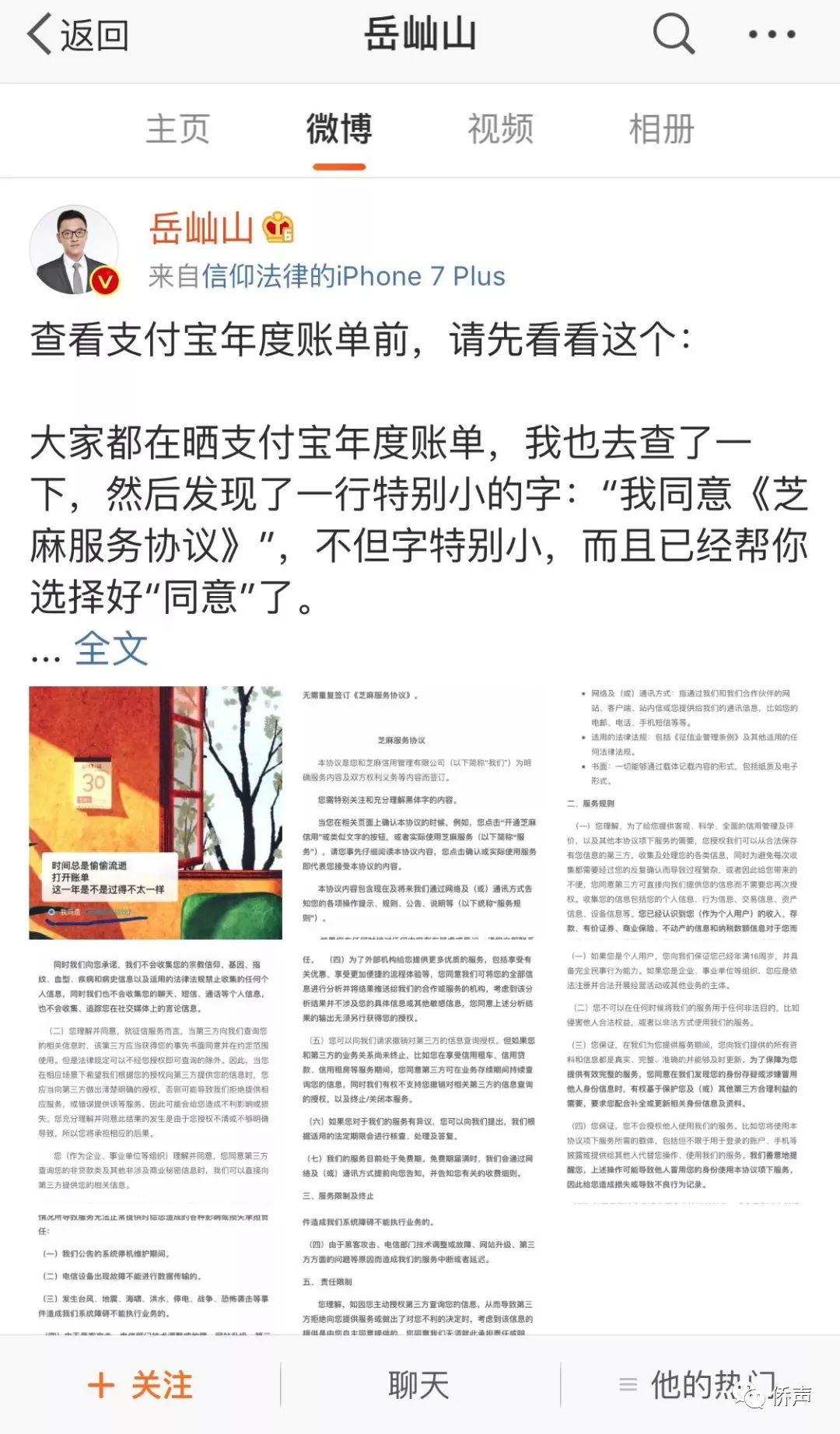 今天早上起 不少消费者都在朋友圈 晒自己的支付宝账单和年度关键词 到了下午,更是刷了屏 但是 很多人可能没有发现 你可能不知不觉又签了一个 “服务协议” 岳成律师事务所合伙人岳屾山在微博上曝出一段话: 岳屾山说的事实,可以从上图中看出来,而且选项已经默认选好。 据岳屾山介绍,这个账单的查看和《芝麻服务协议》没有关联性,所以你选择取消同意,依然能够看到年度账单。但如果你没注意到,就会直接同意这个协议,允许支付宝收集你的信息包括在第三方保存的信息。 怎么样小伙伴们,有没有感觉到深深的“套路”?不管你的年度关键词是才华、是潮,是远方,还是温暖、小确幸,你都不能幸免。 岳屾山律师说,根据《消费者权益保护法》,消费者有选择权,而不是商家替消费者选择。 “或许“芝麻”会说,你可以选择不同意,可是“芝麻”你偷偷摸摸的帮我选好了“同意”,还那么小的字,稍不留神就漏掉了,唬谁呢?” 显然,这个“坑”很多人并不知道,你也许会好奇地又打开支付宝账单看一遍协议,对不起,你再次刷的时候,是看不见这个协议的。 我们看下一下,协议都有哪几个要点:(就像协议里写的:您需要特别关注和充分理解黑体字的内容) 1、你使用服务就等于接受协议 2、根据协议,他们可以直接向第三方提供您的相关信息。 3、根据协议,可以将您的全部信息进行分析并推送给合作机构,还有,有权不支持您撤销第三方的信息查询授权 4、哪怕是服务终止后,他们仍可继续保留你的信息和数据 5、当然,他们是免责的。当提供给第三方信息产生不良后果时,也是一样不用担责 6、不用找你反复确认,产生的风险,也由你自己担着 看到岳屾山律师微博的小伙伴们,已经开始不淡定了。 岳屾山在微博中说,根据《互联网交易管理办法》的规定,经营者应当采用显著的方式提请消费者注意与消费者有重大利害关系的条款。同时对于信息收集,该规定要求经营者需要明示收集、使用信息的目的、方式和范围,并经被收集者同意。而“芝麻”这个根本不给你了解条款的机会,直接让你默认同意,稍不注意就进坑了。 这个坑,还是连环坑,有网友见招拆招,还能发现其他惊喜,如发现华夏信用卡授权、浦发银行授权。 年初了,不仅仅是支付宝账单,市面上还有各种购物APP的账单,现在,你是不是有种“坑”太多的感觉?赶紧去看一眼吧! |