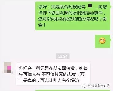 抢劫,是指以暴力或威吓,夺取对方对某物之所有权的一种犯罪行为。大多数的抢劫都包含了暴力的成分,似乎怎么都不能和柔软的“冰淇淋”结合起来。但是今天记者在群里突然看到这一则消息,有人声称有老外利用推销冰淇淋为借口实施抢劫行为。 听闻此事,记者赶忙联系了发消息的人,她随后告诉记者,自己只是抱着“宁可信其有不可信其无”的心态进行了转发,至于最初发这条朋友圈的人,她并不认识。 于是记者顺藤摸瓜,联系上了另一位转发朋友圈的人,她也是一样的回答,大家都是为着提醒侨胞为目的而进行的转发。 自此,冰淇淋抢劫事件真假莫辨,似乎成了一件悬案。