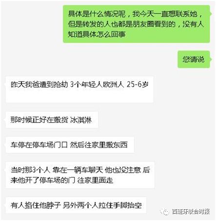 原来被抢劫的是王小姐的父亲,她的父亲经营着一家中餐馆,案发当天下午两点左右,在pozuelo de alarcon地区,当事人正好在搬货,一个人。车子顺势停在停车场门口,当事人则往家搬着东西。附近有三个年轻人,欧洲人面貌,其中一个是金发,靠在不远处的车上聊着天,他也就没有注意。然而正当他打开停车场的门,准备往家里面走的时候,悲剧发生了。那三个欧洲年轻人突然冲过来,并且一个人负责掐脖子,另外两个人一人一只脚,将其手脚抬空,使得当事人无法动弹,接着当事人就晕了过去,在醒来之后,身边所有的货物已经被洗劫一空,甚至连冰淇淋都没有放过。