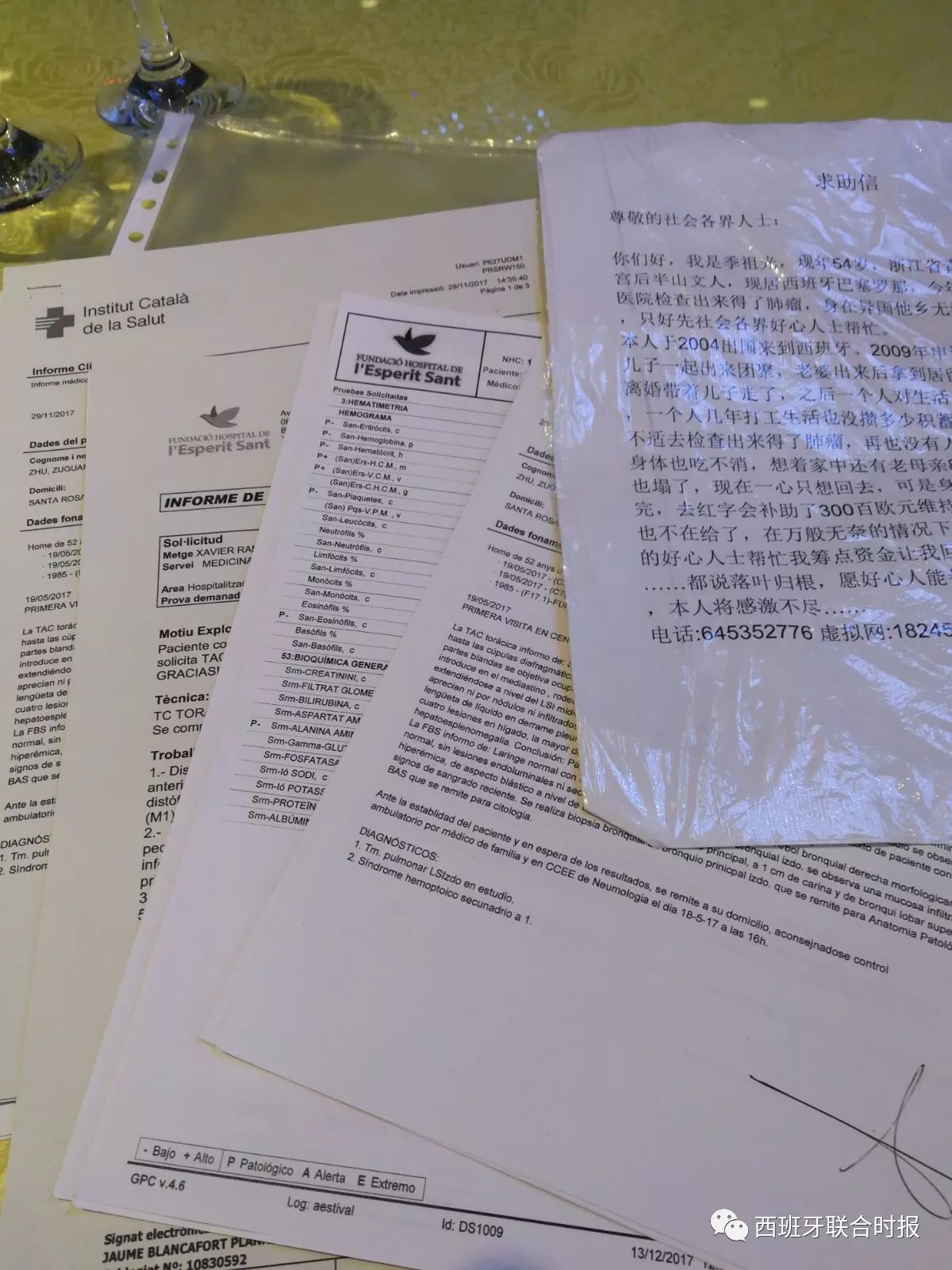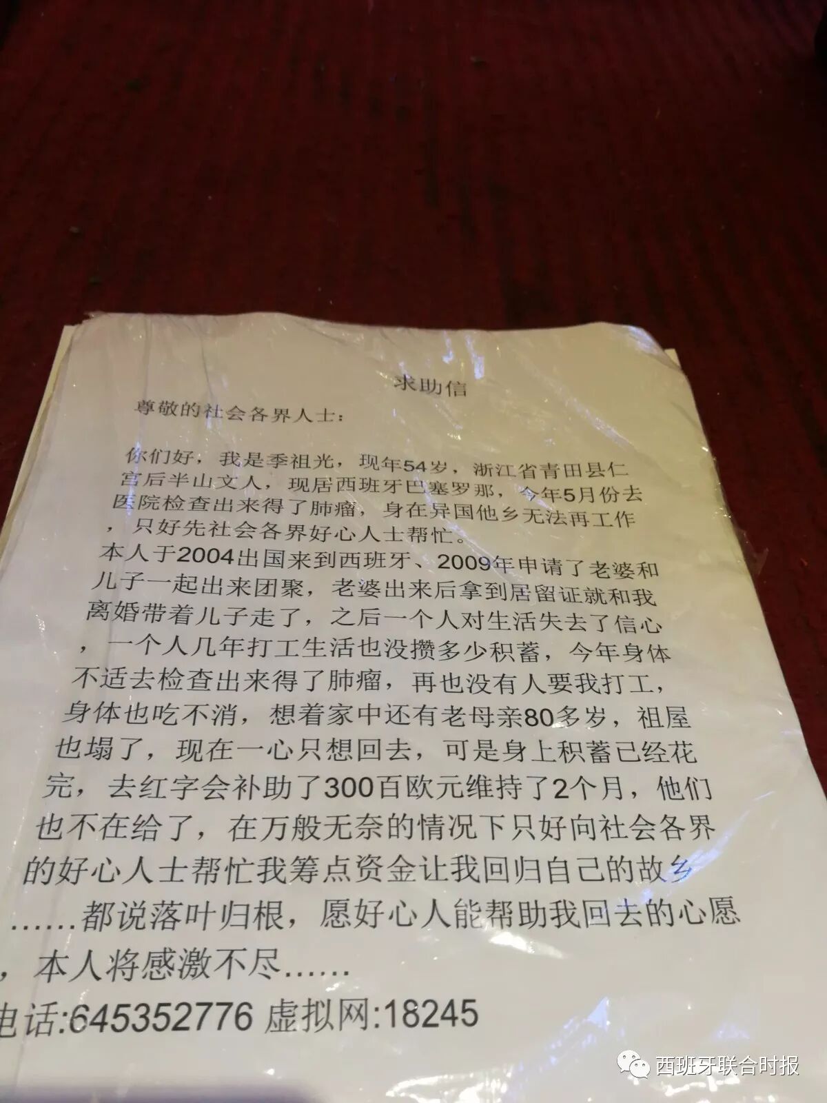 联合时报巴塞罗那讯 记者/江东 2017年12月12日,本报曾经报道了一名四十多岁男子手持一封求助信,前往巴塞罗那Fondo各华人店铺,声称自己身患肿瘤,需要经济援助的事情经过……事件发生后,本报记者与当事人电话取得联系,但因当事人叙述的过程中表述不清,且前后对话出入较大,让记者产生对此产生怀疑。2018年1月6日,本报记者与这名求助的男子见面,查阅了他的病例档案并与了解此事和此人身份的侨胞进行了沟通,确认此人此事情况属实。 图为因化疗已经头发脱落的季祖光 据了解,患病男子季祖光,现年54岁,浙江青田县仁宫乡后半山文人氏,于2004年3月出国来到西班牙,最初在西班牙从事建筑泥水工作。2009年申请其妻子及儿子通过家庭团聚也来到西班牙,但到达西班牙之后,其妻子与其离婚,并将其多年积蓄和儿子带走,对其打击巨大。据知情人告诉记者:“他2009年刚刚把老婆办到西班牙来,他老婆就看他比较老实,把他多年积蓄骗走了,然后提出离婚而且把他儿子也带走了……这件事情对他打击比较大,可能是他患病的最终隐患。” 图为季祖光的求助信 由于婚姻上的失败,使得季祖光对生活失去了信心,加上建筑工地工作辛苦,精神上的抑郁加工作上的劳苦使得他久积成病。2011年开始,季祖光的身体状况开始急转直下,无法再在建筑工地上工作,加上当时受经济危机影响,建筑工作不景气,季祖光只能前往某华人餐馆从事洗碗工工作。 据季祖光告诉记者:“后来身体不好,就没法再做工地了,2011年开始做洗碗工,一开始是咳嗽,我没怎么在意,后来身体越来越不行了,一直做到去年5月份感觉身体不舒服,去医院检查的时候发现自己肺部有肿瘤,然后我就连洗碗工都没法做了,所以社会保险就从今年开始停掉了。” 图为季祖光的看病病历 2017年5月,身患重病的季祖光在身体实在无法支撑的情况下,不得不前往巴塞罗那的Santa Coloma医院就诊,但由于对西语一窍不通,甚至连Santa Coloma医院都只能说是“小鸟医院”(Santa Coloma医院院徽是一只小鸟),加上对医疗知识的匮乏,季祖光只是知道自己身患肿瘤,但至于自己有多严重,自己也无法表述。 身居莱里达的华侨华人联谊总会常务妇女主任郑建珍女士算是季祖光认识的朋友之一,据她告诉记者:“他在西班牙没有亲戚、朋友,人老实的连句话都讲不清,所以每次去医院都要请翻译,一个小时就要30欧元,自己本身和老婆离婚后就没多少积蓄,后来积蓄花完了就没有办法与医院沟通,他就多次打我电话请我帮他翻译……现在他的情况非常严重,肺癌已经转移到了肝部,而且医院已经给他做了一个疗程的化疗,现在一个疗程已经结束,后面什么情况医院怎么安排也不知道。我居住在莱里达,也不能到巴塞来帮他看病,只能通过电话帮助他。” 在采访过程中,面部苍白的季祖光告诉记者:他的肝部经常疼痛,而且化疗已经使得他的头发全部脱落。季祖光告诉记者:“我现在没有任何经济来源,也没办法继续看病,每天吃饭只能吃一点面条,其他东西也买不起。肝部和肺部经常疼的让我受不了……我国内的母亲已经90多岁了,现在她已经知道我得病了,问我什么时候能回去看她一眼。我现在就想社会有爱心的人士能够帮助我一下,为我募集一点资金,我想回国看看我的母亲。” 据了解,季祖光祖籍浙江青田县仁宫乡的山区,家庭情况非常贫穷。据郑建珍女士告诉记者:“他为人非常老实,但讲话讲不清楚,所以给人造成误解。我可以证明他说的情况都属实,而且他现在情况也非常严重了。包括他的家庭,他国内有个哥哥,但家里情况都非常贫瘠,老母亲也年迈了,所以现在希望社会有热心的人士能够帮他一把,达成他的愿望。” |