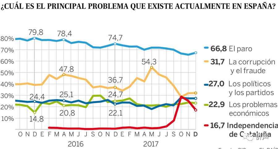 【侨声报】1月9日消息,2017年10月1日加泰罗尼亚独立公投,迄今已经100多天了,经历了公投、警方阻拦、中央政府祭出法宝“宪法155条”、致原加泰领导人的流亡与羁押、12月21日的加泰大选、Ciudadanos党获胜、独立阵营取得议会多数席位?? 折腾了这么多天,相当多的西班牙人还把目光和话语集中在加泰罗尼亚吗?似乎,这个话题已经愈发散热了~西班牙社会研究中心(Centro de Investigaciones Sociológicas,简写:CIS)一项调研报告解读了当下西班牙人最关心的政治与社会话题。 根据报告得来的数据显示,在加泰罗尼亚独立这个话题上,只有16,7%的西班牙人还在关注,相比2017年12月初的调研,当时的关注度高达24,6%,一个月之后的2018年新春,该话题下降了8个百分点。 当下最受西班牙人关心的还是失业,2017年11月份,调研数据揭示65,1%的西班牙人最关心失业问题,2018年1月份,这个比率上升至66,8%;其次,西班牙的腐败也是西班牙人第二大关注点,从去年年底至今,关注腐败问题的西班牙人至少还维持在30%以上。 这份调查从去年12月初开始,在12月21日加泰大选前后也未终中断;12月初的调查也涵盖了11月份人们当时的想法。 报告还做出解释:之所以人们对加泰罗尼亚独立话题散热,其中一个原因是国家核心动用了“宪法155条”,并在12月21日举行了正式的大选;结果也确实能够侧面证实报告中的这一说法。选举结果虽然独立阵营赢得多数席位,但单点而言,Ciudadanos的获胜也逐渐将人们拉回理性和冷静。 2017年12月21日加泰大选期间,西班牙各大区公民在政治话题上集中了一个热度,即:是否希望自己所在大区的自治权扩大更广泛的范围,大量回答是!——这样的观点在大选前大约有13,5%的西班牙所主张,在大选期间增长至16%。 社会研究中心还发现,在诸多可能产生不安定因素的领域中,如失业率、就业质量、养老金、司法管辖、恐怖主义等,关心这些问题的人数也在上升。 至于期待,报告对经济改善、政治阶层变化两个选项做了调查,有23,5%的西班牙人相信2018年会变好,认为不会有什么改善的人则占14,8%。 |