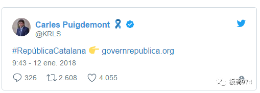 来自埃菲社消息,前加泰罗尼亚主席普伊格蒙特于1月12日上午在自己的推特社交平台上发布了名为“共和国政府”的网站链接,使用了加泰语“议会”(Generalitat)的标志,包括相关新闻和“共和国政府”的电子邮件地址。