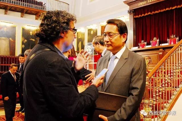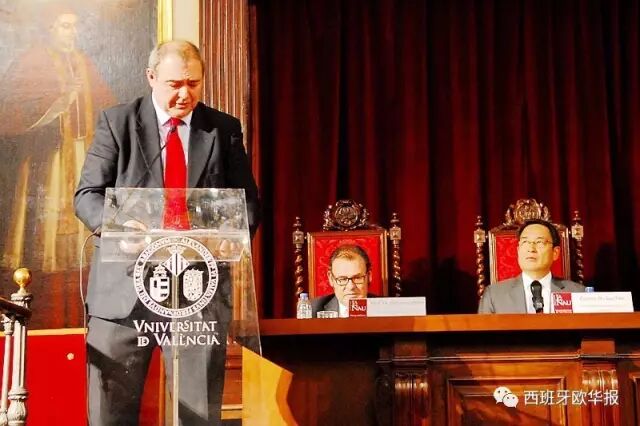 主席台 瓦伦西亚大区政府对欧盟及其它外交关系代表Joan Calabuig先生首先发言。他表示非常高兴吕凡大使先生能够再次来到瓦伦西亚。他说,在最近几个月里,瓦伦西亚与中国之间的联系有了长足的进展,双边交流不断取得进步,这都同吕凡大使所做的诸多努力分不开的。他还说,相对瓦伦西亚和中国在经贸领域取得巨大成绩的另一面,瓦伦西亚孔子学院在当地对中国文化的宣传也起到带头作用。 瓦伦西亚市市长Joan Ribó先生在发言中表示,在过去的十个年头里,孔子学院的教职员工们风雨同舟,把中国、西班牙两个民族的手臂紧紧拥抱在了一起。他作为瓦伦西亚的市长,长期以来都非常重视语言文化教育工作,瓦伦西亚这座城市,希望让所有来自不同国家、不同籍贯的人都一样拥有家的感觉。Ribó先生还高度评价了瓦伦西亚大学孔子学院在“丝绸之路?一带一路”瓦伦西亚部分所做的贡献,同时祝愿孔子学院的明天更美好。 瓦伦西亚大学孔子学院西方院长Vicente Andreu先生发言 瓦伦西亚大学孔子学院西方院长Vicente Andreu先生做了精彩的发言。他首先介绍了瓦伦西亚孔子学院建院的历史,以及十年来所取得的成绩。Andreu先生在发言中感谢了中国政府使馆、中国国家汉办、东北师范大学和所有曾经为孔子学院建设出力的老师、朋友。“众人拾柴火焰高”Andreu院长用中国的成语表达出了内心的感受,他同时用另外一个成语“读万卷书,行万里路”来勉励孔子学院未来发展之路。 吕凡大使发言 中国驻西班牙大使吕凡先生发表重要讲话。第一是感谢全体瓦伦西亚大学孔子学院的师生;他引用习近平总书记“文化自信”,向人们强调了中西文化交流的重要性,也让到场中国同胞们更加坚定在全世界范围内弘扬中国文化的自信心;吕凡大使用多个数字举例说明中国如今积极扩大对外开放、对全球经济发展的贡献、大力开展旅游业、有效治理贫困等方面所做的努力,他还用孔子的名句鼓励人们要有战胜困难的勇气,同时也指出,中国角色由世界工厂向世界市场转变的决心和信心。 吕凡大使接受采访 吕凡大使最后说:“随着更多的孔子学院在西班牙各个城市的建立,以及中西两国文化交往的频繁,西班牙每天都会有越来越多的人认识中国、了解中国,不论是从中国古文化、影视、音乐,还是从获得诺贝尔文学奖莫言的作品里。”大使讲话完毕,全场掌声经久不息。所有领导在前台合影留念,瓦伦西亚大学孔子学院十周年院庆活动圆满结束。