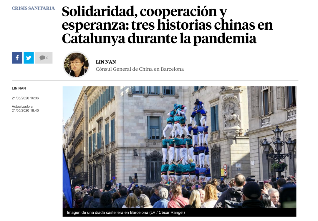| 2020年5月21日,驻巴塞罗那总领事林楠在西班牙主流媒体、西网络阅读量最大的《先锋报》发表署名文章《团结、合作与希望——加区新冠肺炎疫情期间的三个中国故事》,全文如下: