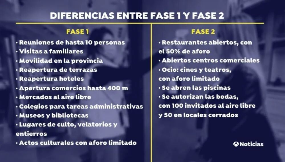 西班牙目前正处于冠状病毒降级计划的第一阶段和第二阶段。 在第一阶段,可以在省内出行,但不能出省,仅在市政当局之间。如果能保持安全距离,则最多允许10人的聚会。 在第二阶段,仍然不能出省旅行,但聚会最多可容纳15人。