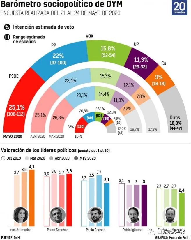 新冠病毒危机导致西班牙联合政府PSOE和Unidas Podemos两党陷入僵局,反对派政党也一直在加把劲试图缩小选票差距。不过据《20分钟》5月一份民意调查显示,假如现在重新举行大选,PSOE党将以25.1%的选票再次“赢”得胜利。