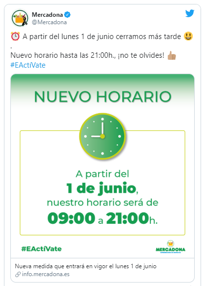 西班牙20分钟报消息,自疫情开始后,Mercadona连锁超市就采取了措施保护员工和客人的健康和安全。而随着疫情的不断变化,超市的防疫措施也在不断更改。 今日,Mercadona再次修改了超市的营业时间。 从6月1日,Mercadona开放时间为09:00至21:00,比现在增加一小时。 同时,Mercadona依然保持之前的防疫措施,例如控制所有超市的容量,标出最小安全距离的标记,以确保人与人之间的距离为一米。在入口处,也将标出人们等待时需要遵守的最小距离。超市仍然提供消毒水和纸,以便顾客清洁购物车的把手。 来源:板鸭之声 |