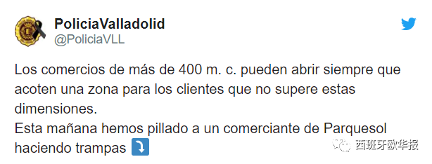 Valladolid警方为此还在其Twitter账号上发文表示:400平米以上的商店可以开店,但是前提是要为顾客划定不超过这个面积的活动区域。就在今天早上我们就抓到Parquesol一个商家不守规矩,作弊。