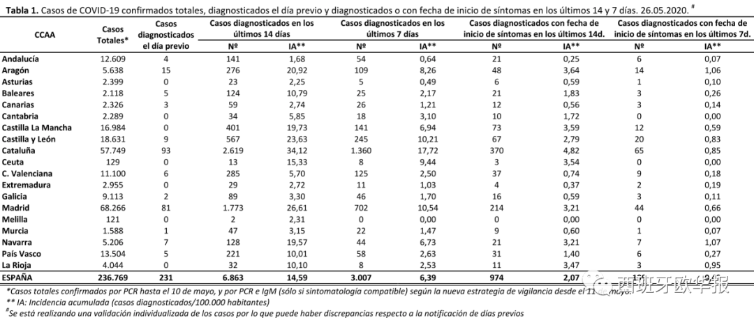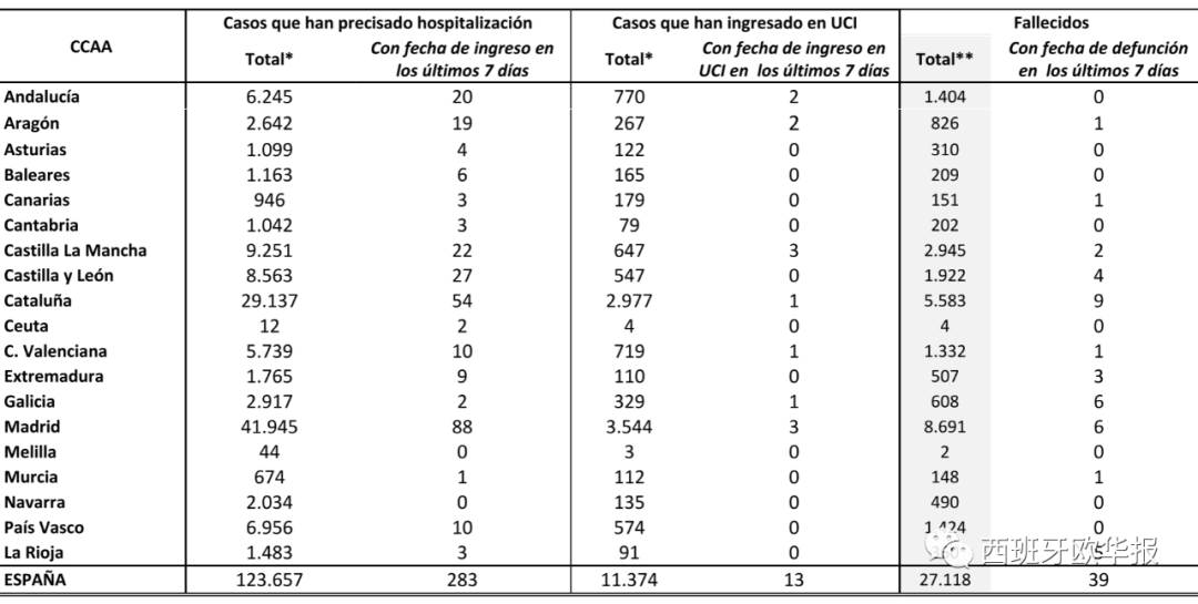 | 欧华报综合消息(编译 易安) 截止发稿前西班牙卫生部发布数据,经过PCR核酸检测的确诊患者累计236769人,治愈149576人,死亡27118人。 截止发稿前卫生部数据,19个省市共236259例确诊患者,新增231例,确诊患者分布如下: