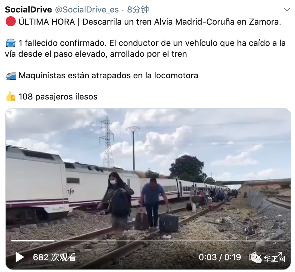 据西班牙媒体okdiario报6月2日消息,一列马德里开Coruña的Alvia 11553火车于本周二16:20点在La Hiniesta(Zamora)出轨。火车与一辆汽车相撞后发生了事故,并且冲出了轨道,目前已造成一人死亡,司机受伤。