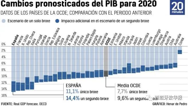 而在本周三发布的半年度展望报告中,经合组织(OECD)比西班牙政府和欧洲委员会更为悲观。报告显示,西班牙成为受疫情危机打击最大的国家之一,今年的国内生产总值(GDP)将下降11.1%,排在西班牙之前的为英国和法国,各自下降11.5%和11.4%;但是,如果出现第二波疫情爆发,该值将下降14.4%,届时将是世界各国中下降幅度最大的国家,法国和英国则会掉到第二第三名。