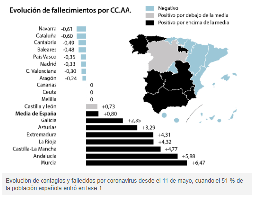 至于新冠死亡人数,自降级开始以来,穆尔西亚死亡人数增加最大。全国死亡总数也增长了0.8%。