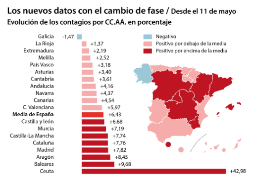 西班牙ABC报消息,5月11日,西班牙的防疫降级正式开始。防疫降级由“新常态”之前的四个阶段组成,目的是有秩序的恢复正常生活。就在一个月前,西班牙有51%的人口进入了第1阶段,从那开始,酒吧和餐厅、商店逐渐开业,可聚会人数逐渐增加,这也对疫情的发展产生了一定的影响。 根据卫生部每天提供的数据,这种不对称降级在不同地区产生了非常不同的影响。例如,官方消息称加利西亚今天的传染性要小于一个月前。而自防疫降级以来,休达的感染人数就不断增加,增加了将近43%。 此外,全国感染总数增加了6.43%,在这一比例之下的大区有Valencia,Canarias,Navarra,Andalucía,Cantabria,Asturias,País Vasco,Melilla,Extremadura,La Rioja及Galicia。马德里增加了7.82%,超过全国平均水平。