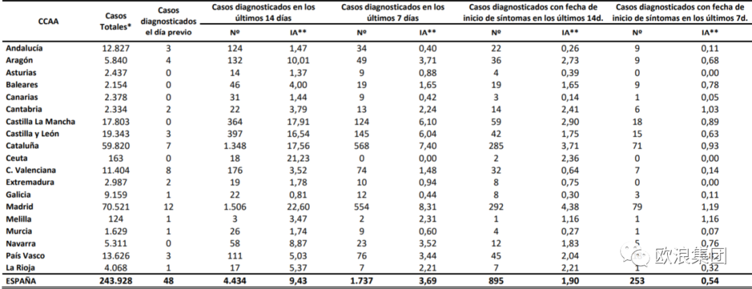 欧浪新闻6月14日(马德里 柳传毅编译)依据西班牙卫生部的疫情数据,西班牙至今日中午为止,累计PCR核酸确诊243928例,对比昨天的数字,今天比昨天多了323例,但卫生部只记录48例为过去24小时的新增,属于极低,因卫生部只承认在24小时内测出的确诊为日增数。死亡累计保持为27136例,这个数字已经八天未更新。 对照昨天的数据,马德里升至70521例,比昨天多123例,加泰罗尼亚至59820例,比昨天多114例,卡斯提亚·莱昂比昨天多19例,累计19343例,卡斯提亚·拉曼查增长了27例,合计17803例,除了这四个严重大区,其余大区都只新增几例左右,较多的是瓦伦西亚+11和巴克斯+10例,北部阿斯图尼亚斯和纳瓦拉两个大区则是0增长,因此,不利数据继续在马德里和加泰罗尼亚。 西班牙今日一个信息是再次纠正了西班牙开放欧盟内部边境的日期,大前天和昨天,外交部和卫生部先后表示西班牙推迟到7月1日才重新开放欧盟内部边境,但首相桑切斯在今日的政府新闻会上再一次更改,表示西班牙从6月21日起重开欧盟边境。桑切斯是今日与全国自治大区政府主席举行了最后一次视频会议和作出讨论后作出了这个更改。
