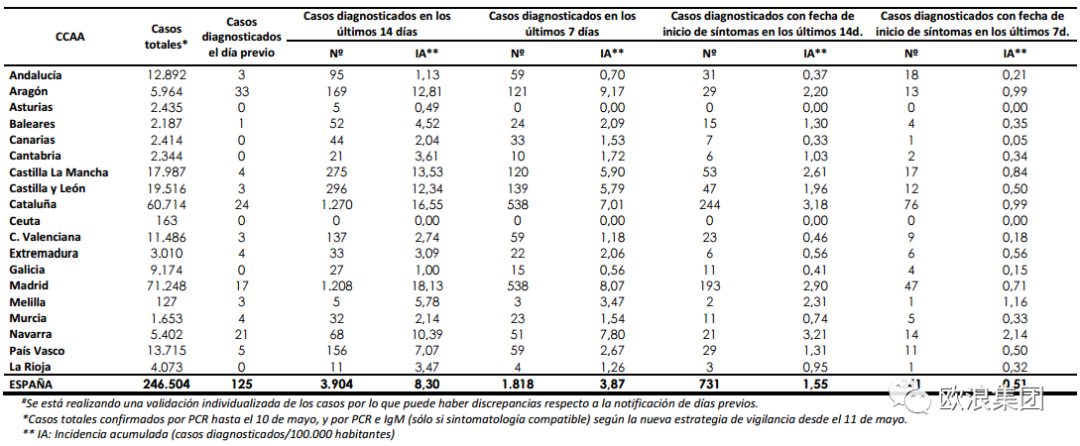 欧浪新闻6月22日(马德里 柳传毅编译) 西班牙《世界报》说,西班牙所谓的“新常态”将不允许松懈对冠状病毒的防范,西班牙从昨天起解除警报状态进入到“新常态”,但同样是昨天,西班牙有多个省市镇传出新的传播点,包括Murcia、Cartagena、Valladolid和Navarra自治大区,但最严重的为阿拉贡自治区Huesca省,有三个小镇重新返回阶段2,而且可能重新封城。 依据西班牙卫生部的疫情数据报表,西班牙累计PCR确诊246504例,过去24小时新增125例,但累计数字而言,今日比昨天多232例,等于有一百多例在其他日期测出,但至昨天才出现检测结果。 单日确诊增长方面,马德里+25(其中17例为过去24小时测出),加泰罗尼亚+79(其中24例子为过去24小时测出),卡斯提亚·莱昂+17,卡斯提亚·拉曼查+22,以上是四个是全国最严重的大区。对于马德里而言,过去两天的日增都显著减少。加泰罗尼亚则相反,加泰罗尼亚最近一周多的疫情数据波动很大,一周多前曾持续几天日增降至只有十多,然后一下回升到200-300多例,但今日的日增低于昨天115和前天80例。 纳瓦拉特别自治区今日宣布识别到两个新的连环传播点,最近三天确诊21人。大区卫生部门指出两个疫情点在纳瓦拉以北和潘普洛纳小镇及其周边,属于家庭和周边人范围内的连环传播,前天确诊8例,昨天周日再确诊3例。 卡斯提亚·莱昂自治区下城市巴利亚多利德(Valladolid)市Hospital Río Hortega医院近日同样出现新传播点,至今日确诊18例。
