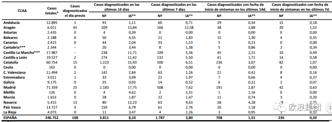 欧浪新闻6月23日(马德里 柳传毅编译) 依据西班牙卫生部的疫情汇报,西班牙累计PCR确诊246752例,24小时新增108例,但累计数字比昨天多了248例,这是因为有一些案例属于在其他日期检测,而结果至昨天才出现。其中,马德里新增111例,加泰罗尼亚新增40例,卡斯提亚·莱昂新增11例,阿拉贡新增47例,该大区有新爆发,预计这几天的确诊会保持显著上升,其他大区的增长都只有几例或十来例左右,第四严重的卡斯提亚·拉曼查以及坎塔布尼亚两个大区则未能及时更新数据。西班牙累计死亡28325例,比昨天多一例,过去7天合计新增死亡14例,其中马德里5例,卡斯提亚·莱昂4例。