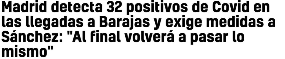 根据西班牙媒体报道, 马德里自治区主席Isabel Díaz Ayuso表示, 自5月11日到6月11日期间, 在马德里Barajas机场的旅客中发现32名确诊感染者, 其中11名为输入型病例。其中有5人情况严重需要住院治疗: 2人在12 de Octubre医院, 1人在VHospital Infanta Elena 医院, 1人在Gregorio Marañón医院, 还有1人私人医院。 西班牙卫生部已经要求机场采取三道防疫检查措施, 例如入境者填表、测体温和目测病征。但是Isabel Díaz Ayuso认为这些远远不够, 如果再这样继续下去恐怕会重蹈覆辙。她认为各个自治区政府需要和中央政府展开会议, 严肃地商谈关于境外输入病例的管控措施。 来源:华人资讯传媒 |