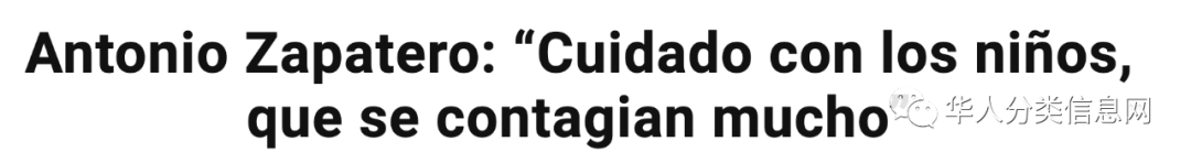 华人分类信息网6月27日消息,据西班牙媒体报道,马德里卫生部副部长安东尼奥·萨帕特罗(Antonio Zapatero)在出席卫生委员会时警告说,已有大量未成年人新冠检测呈阳性反应,要注意儿童,他们也非常容易感染。这是根据马德里卫星城市Torrejónde Ardoz全民血清阳性率研究的结果得出结论。