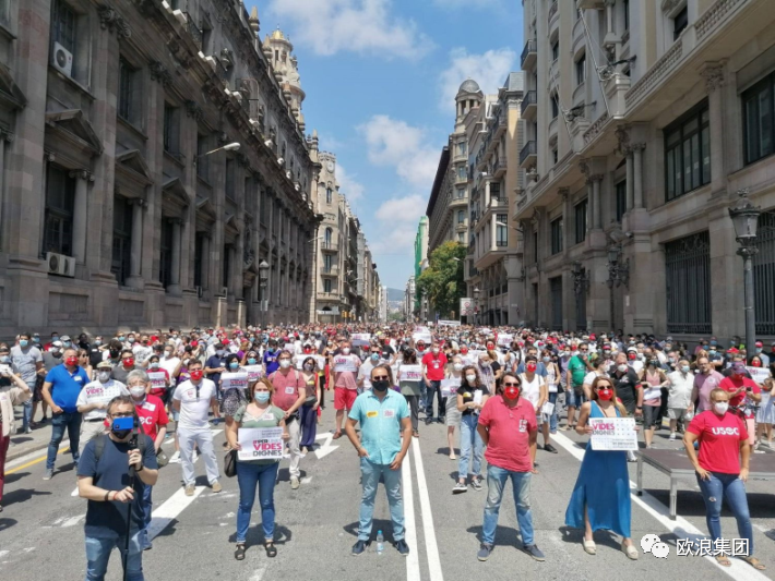 欧浪新闻6月27日(马德里 柳传毅编译) 《国家报》报道,本周六,数以千计的西班牙人在西班牙主要工会的发动下,聚集在多个城市的街头举行集会示威,集会以“我们要走出去”为口号,要求西班牙所有政治力量放弃一切政治冲突,在西班牙经历了严重的病毒危机后“重建国家”。西班牙几个大工会一共在全国各个城市发动50次示威,多数示威发生在今日周六,一些示威则在明天周日,马德里示威在今日下午7点30分,而加利西亚、塞利维亚、加那利群岛则在今早举行了示威。 今天上午的主要聚会发生在巴塞罗那(图),大约有1500人参加了街头聚会示威,示威行动采取了避免病毒传播的安全距离,示威者要求西班牙政治组织达成一项全国协议,以挽救西班牙国民、就业和工资。