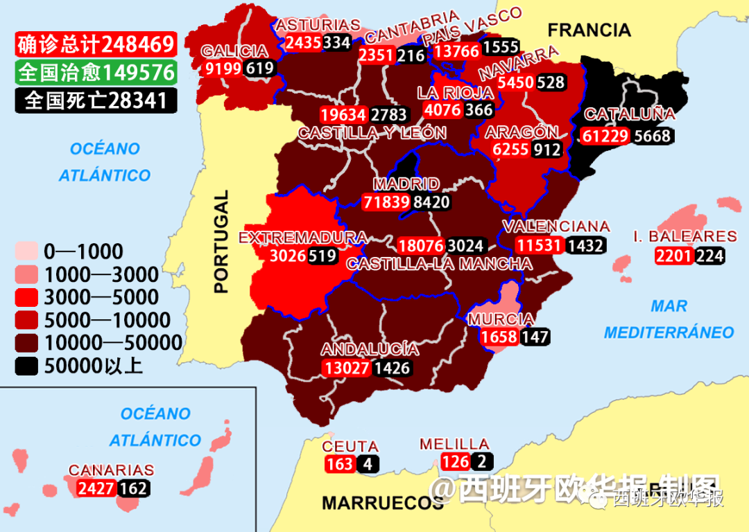 欧华报综合消息(编译 易安)截止发稿前西班牙卫生部发布数据,经过PCR核酸检测的确诊患者累计248469人,治愈149576人,死亡28341人。