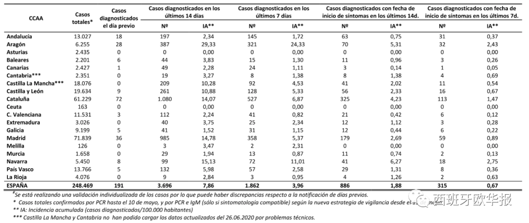 备注:西班牙采用了新的统计系统,将各大区每日通报的患者人数,按照“前一日确诊”、“过去14天内确诊”、“过去7天内确诊”、“过去14天内出现症状”和“过去7天内出现症状”区分统计。