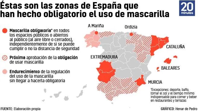 自从国家警戒状态结束后,新常态制定了一些预防新型冠状病毒的措施,例如在封闭的地方,公共交通以及无法保证最小1.5米安全距离的地方必须强制使用口罩。 但是,几周后在西班牙各地暴发的新疫情使许多自治社区加强了这项措施以防止病毒传播。 加泰罗尼亚暴发了几次疫情,其中包括莱里达的一次疫情,也是当今最令人担忧的疫情之一,这迫使加泰罗尼亚政府规定在开放和封闭的场所强行使用口罩,无论是否能够保持安全距离。 仅24小时后,巴利阿里群岛就仿效了这项措施,该措施于本周一生效,具体规定与加泰罗尼亚相同:除非在沙滩上游泳池游泳,健身房运动,需要呼吸气弹奏乐器或食用食物和饮料时可以不戴口罩,否则即便在餐厅和酒吧露台,在没有吃饭和喝东西的情况下也需要戴口罩,否则将罚款100欧。 巴斯克大区决定采取同样的行动。自上周六以来,埃斯特雷马杜拉(Extremadura)也已强制实施该防疫措施,目前该地区有四起疫情,其中三起在巴达霍斯(Badajoz)市,另一起在纳瓦莫拉尔德拉马塔(Navalmoral de la Mata)。 就加利西亚而言,该大区于6月29日就收紧了使用口罩的规定,无论在公共道路上还是在露天场所,口罩的使用都是强制性的,在封闭空间中也必须使用它。 安达卢西亚,阿拉贡,拉里奥哈,纳瓦拉,阿斯图里亚斯和穆尔西亚本周也将批准强制使用口罩,即使在可以保持社交距离的情况下。 西班牙政府开始为第二波新冠疫情做准备!